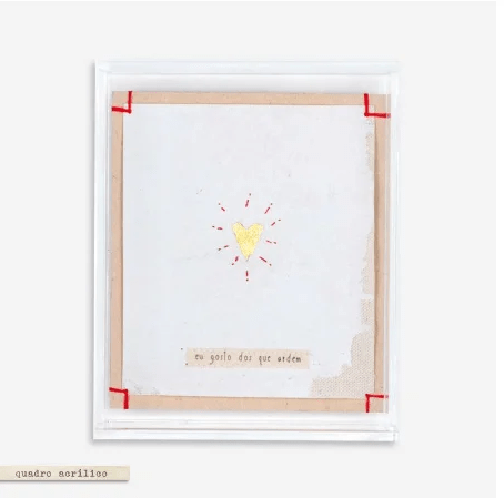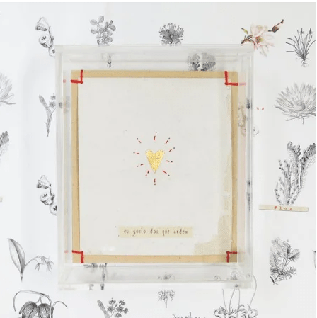 Ao centro se destaca um flamejante coração dourado feito através do bordado, sob tela de tecido cru. Na parte de baixo a frase "eu gosto dos que ardem" compõe a arte.