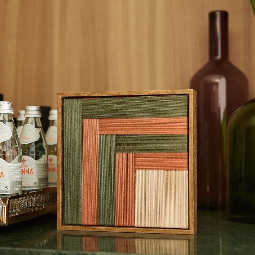 O Quadro Planos Goiaba é uma peça artística que explora a complexidade das padronagens sobrepostas, criadas através de técnicas lineares. Feito com fios de algodão encerado, este quadro exibe um design moderno e sofisticado. Emoldurado em freijó com uma profundidade de 4 cm, cada obra é um exemplo de artesanato meticuloso e elegância contemporânea.