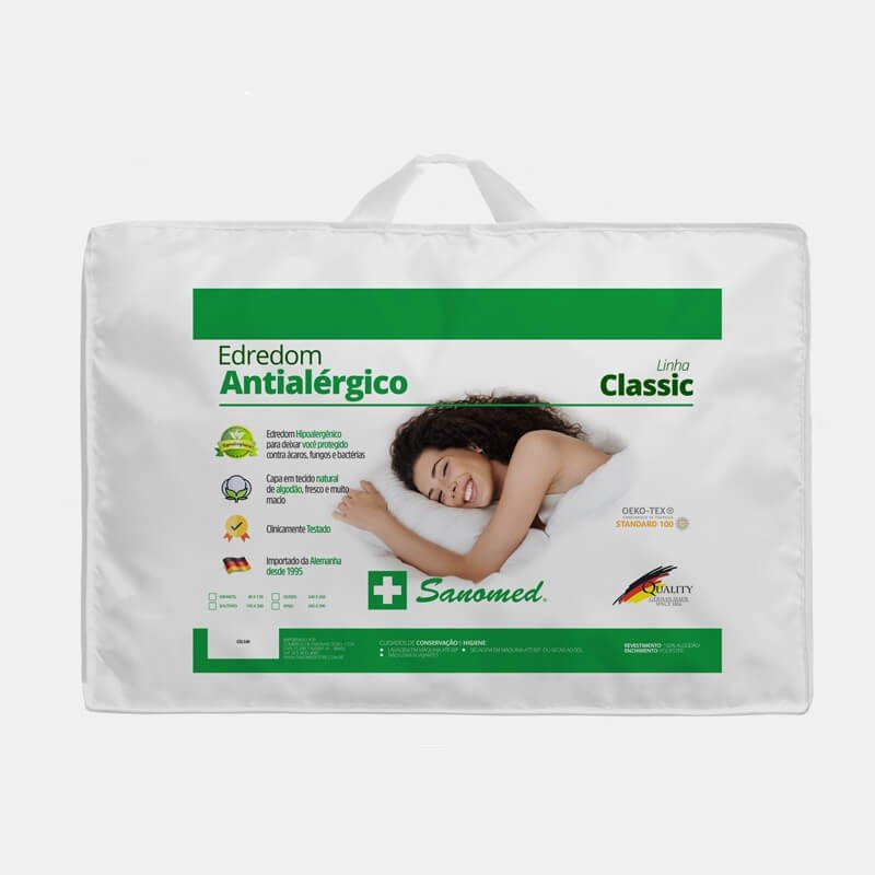 O Edredom Antialérgico da Linha Classic da marca alemã Sanomed, é confeccionado com materiais hipoalergênicos de alta qualidade, que protegem contra ácaros, fungos e bactérias.
