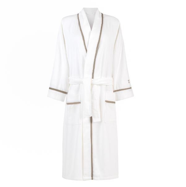 Os roupões Domenico e Maelle da Trussardi possuem toque aveludado, de extrema maciez. Confortáveis e sofisticados, os roupões Trussardi são extremamente macios. Com nova modelagem, a aplicação do bordado T surge como detalhe na manga, juntamente com novas cores nos debruns, criando um efeito elegante e refletindo o cuidado mesmo após o banho
