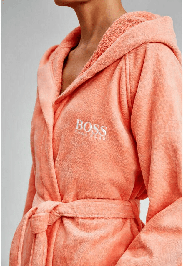 O roupão feminino da linha Plain é uma peça simples e elegante, com textura aveludada. Modelo curto com capuz que apresenta o logotipo da Boss Home bordado no peito em tom sobre tom e cinto discreto. A trama de loops curtos e apertados dá ao quimono uma sensação densa e revigorante.