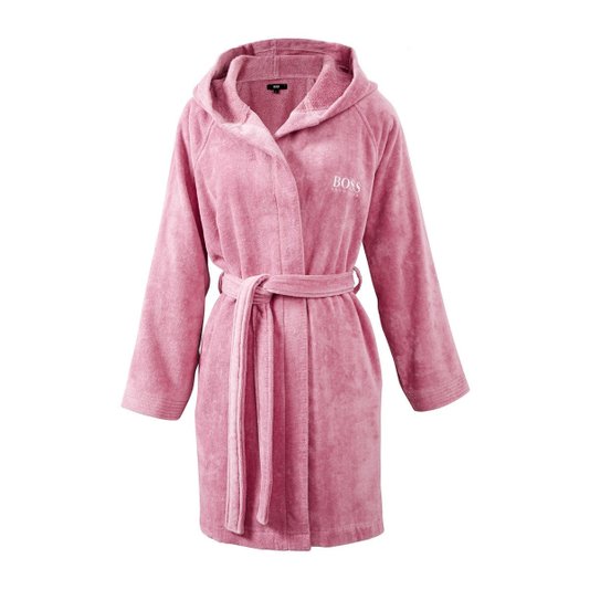 O roupão feminino da linha Plain é uma peça simples e elegante, com textura aveludada. Modelo curto com capuz que apresenta o logotipo da Boss Home bordado no peito em tom sobre tom e cinto discreto. A trama de loops curtos e apertados dá ao quimono uma sensação densa e revigorante.