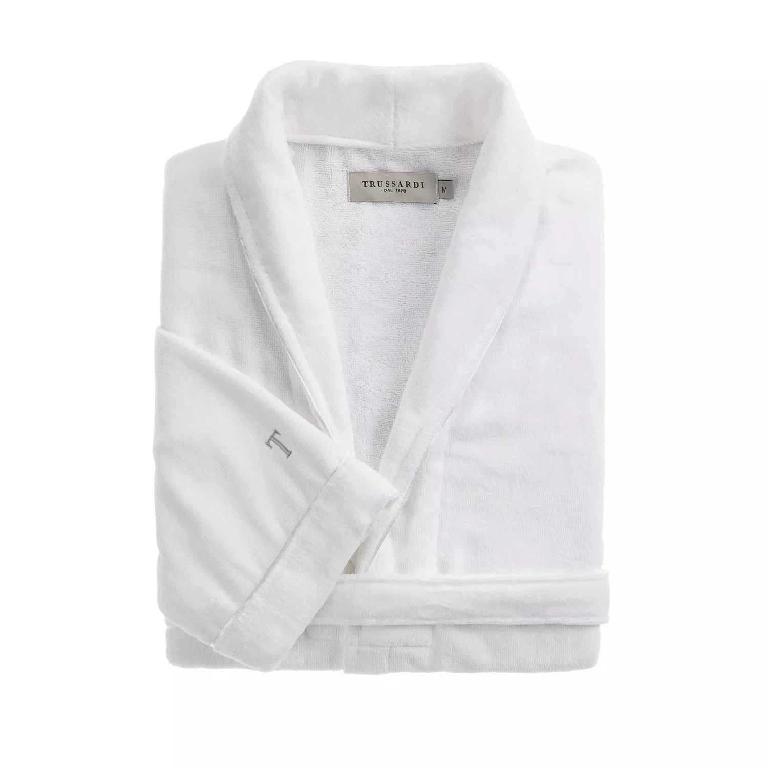 Os roupões Trussardi são mais que vestimenta; são convite ao conforto e ao aconchego. Feitos de algodão com tecnologia Cottone Speciale, o roupão Barone oferece sensação envolvente. Nova modelagem e atenção aos detalhes, bordado do "T" nas mangas adicionam sofisticação. Com toque aveludado e fibras leves, proporciona caimento impecável, criando ambiente de spa no lar.