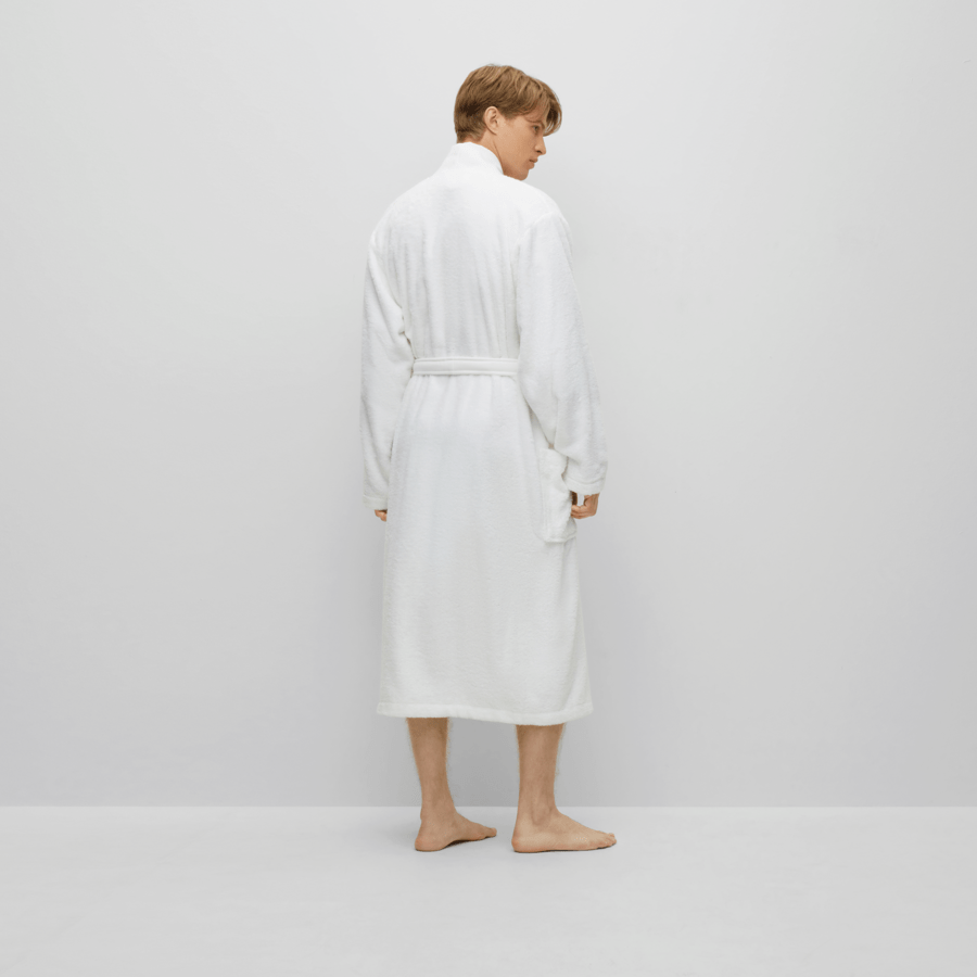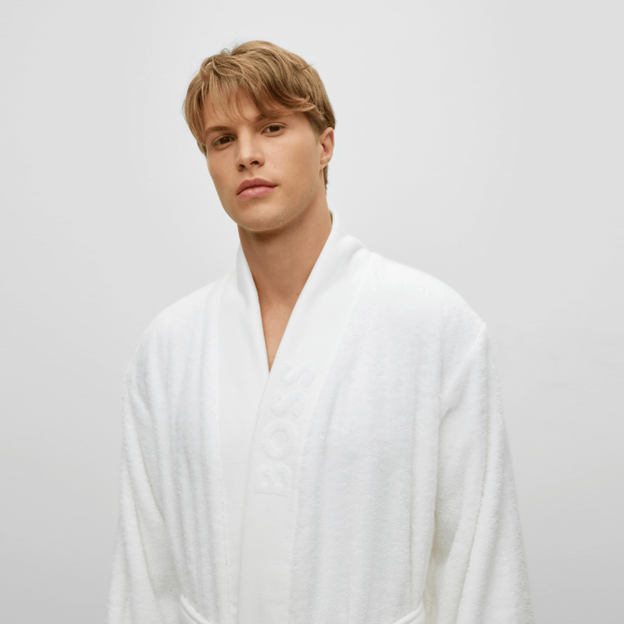 O Quimono Plain da Boss Home é simples e chique, apresenta o logotipo da Boss Home bordado em contraste ao longo de sua gola com cinto tom sobre tom. A trama de loops curtos e apertados dá ao quimono uma sensação densa e revigorante. Confeccionado em fino algodão egípcio com laços trançados para maior conforto e absorção.