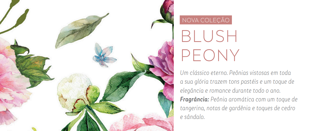 Harmoniosa estampa de peônias em tons pastéis, coloridos e alegres. O design desta coleção combina perfeitamente com a sua fragrância floral, trazendo um aroma elegante de peônia aromática com toque de tangerina, gardênia, cedro e sândalo. Um toque de romantismo para todas as épocas do ano.
