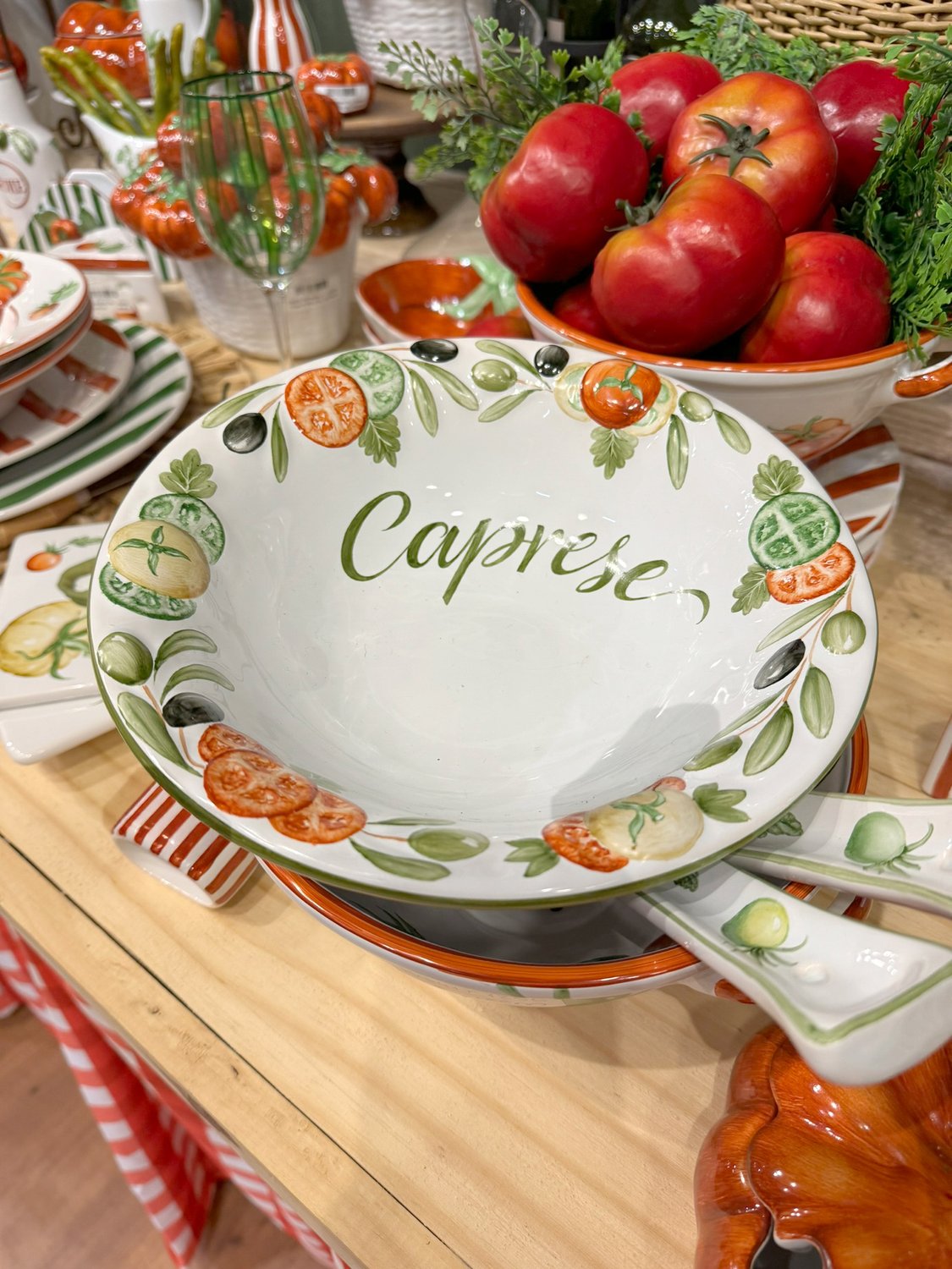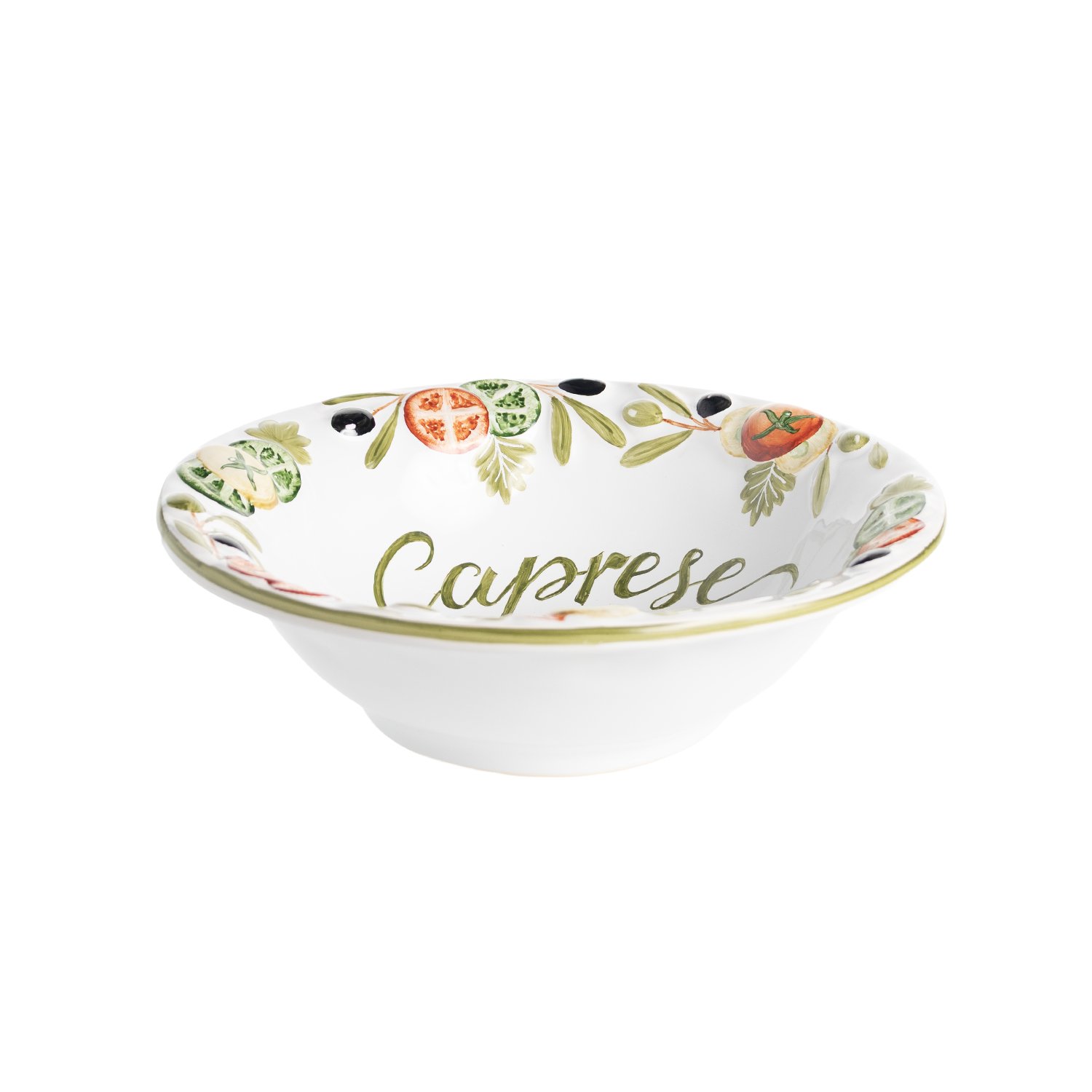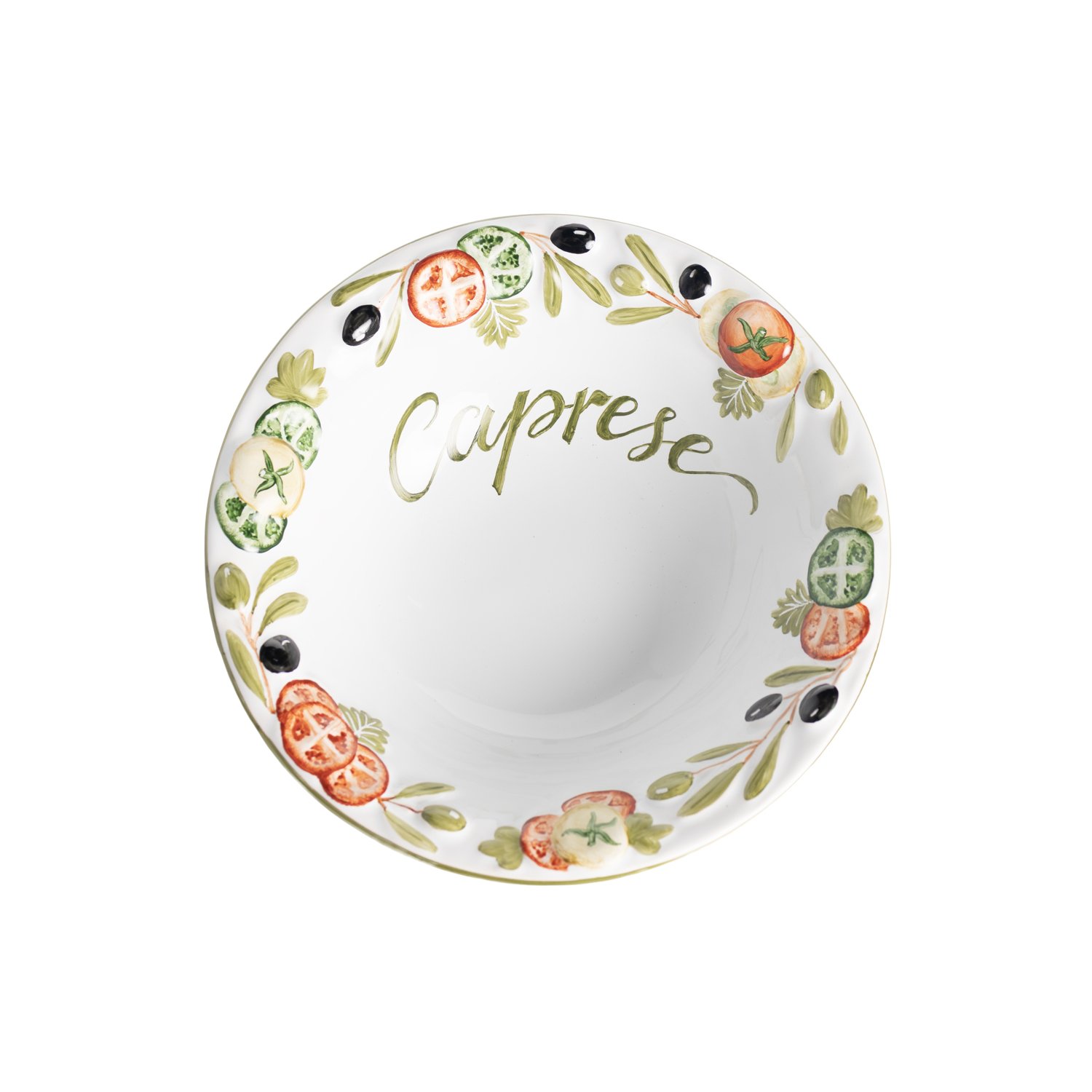 Saladeira de tamanho grande em alto relevo com desenhor de galhos, azeitonas e tomates e escrita Caprese. Produzida em cerâmica artesanal com pintura manual nas cores verde e vermelho.