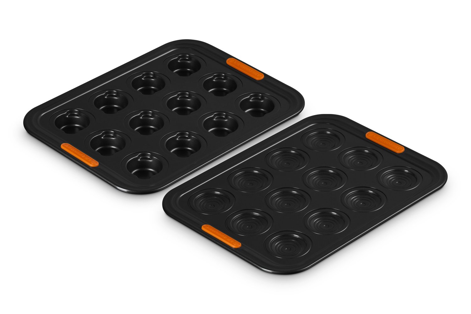 Jogo de 2 formas antiaderente para assar 12 cupcakes em formato de mini cocotte, sendo uma forma no formato da tampa e outra forma no formato da base da mini cocotte. Edição especial em celebração ao centenário da marca.
