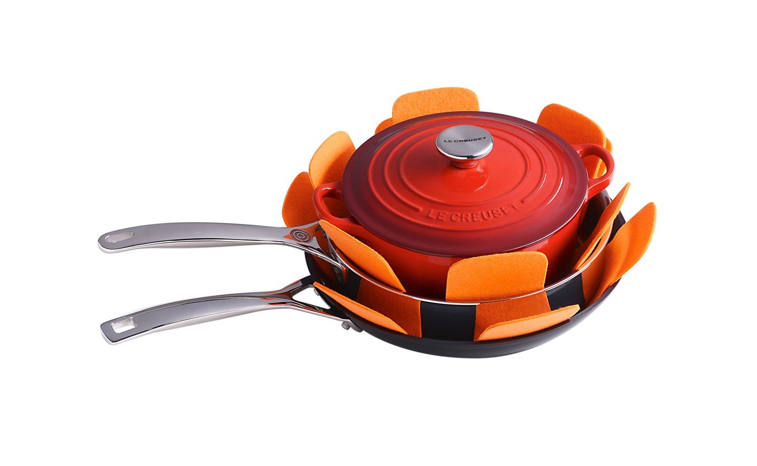 Produzidas em feltros os protetores de panela evitam arranhões nos utensílios ao serem armazenados. Resistentes e duráveis funcionam como uma camada macia e acolchoada entre as panelas, frigideiras e grelhas, não permitindo que criem atrito.