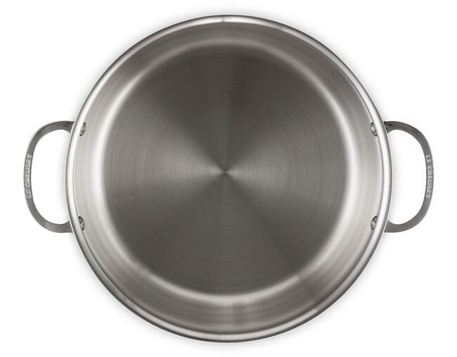 Stock Pot da Le Creuset. Feita de aço inox, projetada com 3-Ply, ela conduz e distribui o calor uniformemente, sendo ideal para várias receitas. Possui um núcleo de alumínio que aquece de maneira rápida e uniforme e é protegido pelo aro laminado, vedado e polido. Sua camada externa é magnética e infundida com titânio para resistir à descoloração. Já a camada interna é feita de aço inoxidável de grau cirúrgico para uma superfície de cozimento segura e estável. A peça que faltava em sua cozinha!
