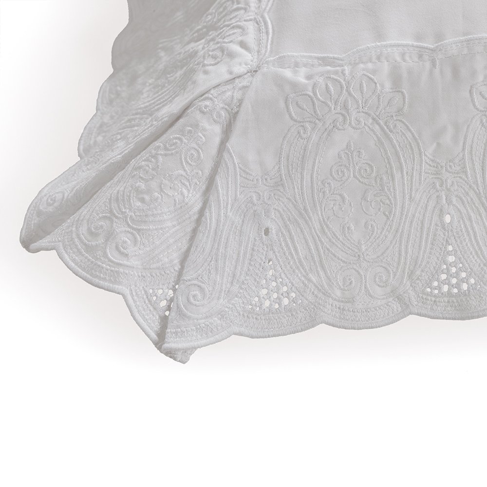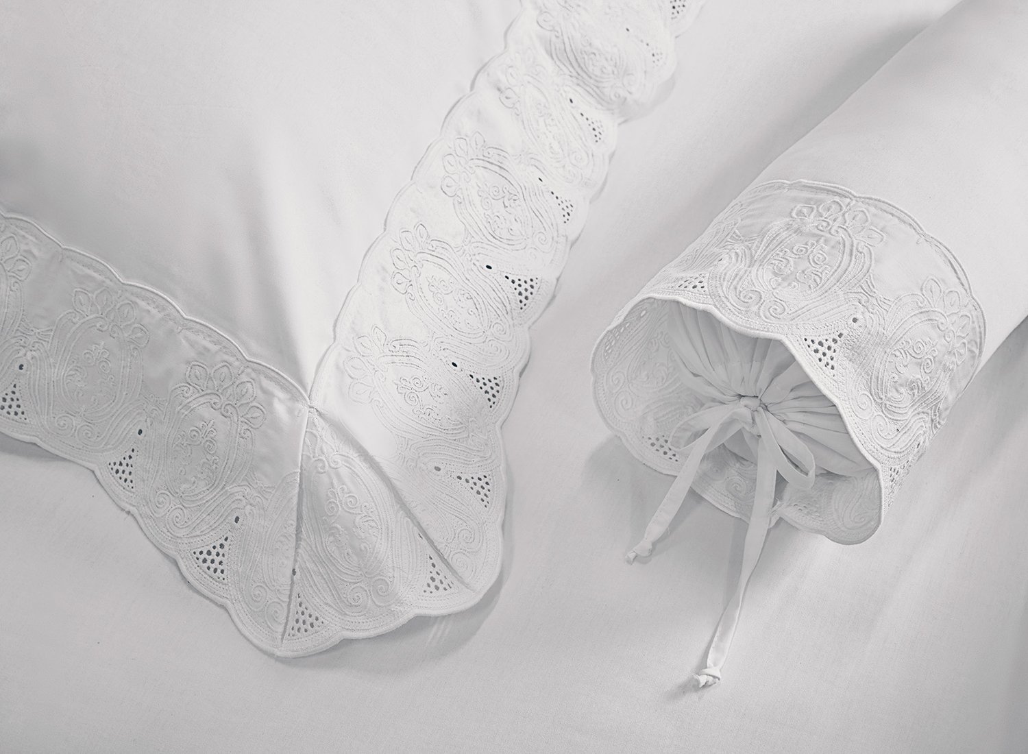 Acabamento: Cetim 300 Fios; Fronha com 3 abas; Tira bordada aplicada e canto borboleta; Tecido sanforizado;