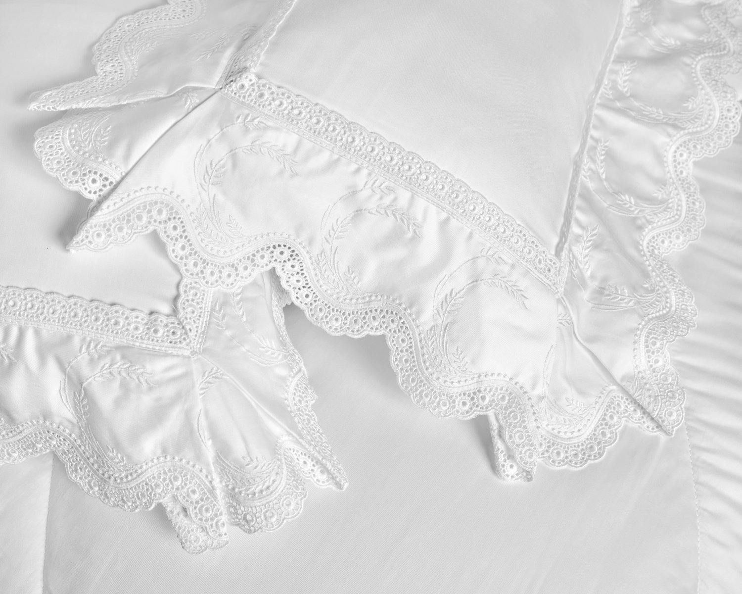 Com a riqueza da aba dupla, o bordado em 300 fios do jogo de camaRomanza retrata de forma delicada a vegetação das encostas de Cinque Terre, apresentando um acabamento repleto de detalhes que confere ao ambiente um ar romântico e clássico.