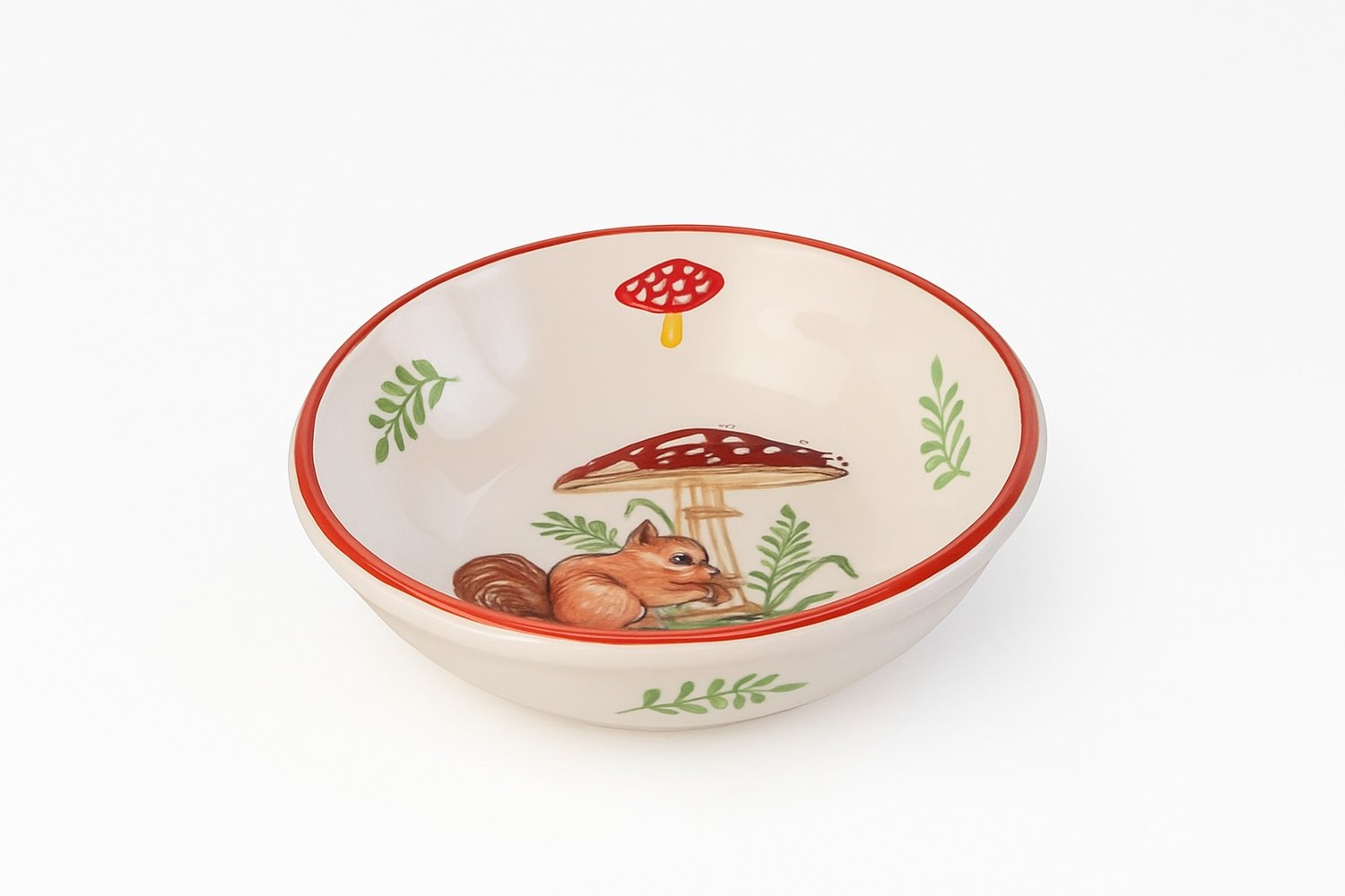 Coleção: Esquilo com Cogumelo Material: Cerâmica / Pintura Manual Acabamento: Alto Relevo Cores: Branco, Vermelho e Verde Composição: 01 Tigela Circunferência: 16 cm Altura: 5 cm