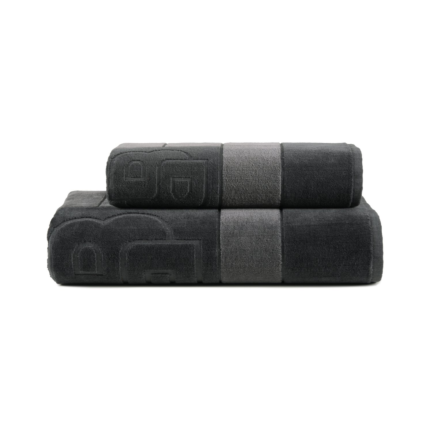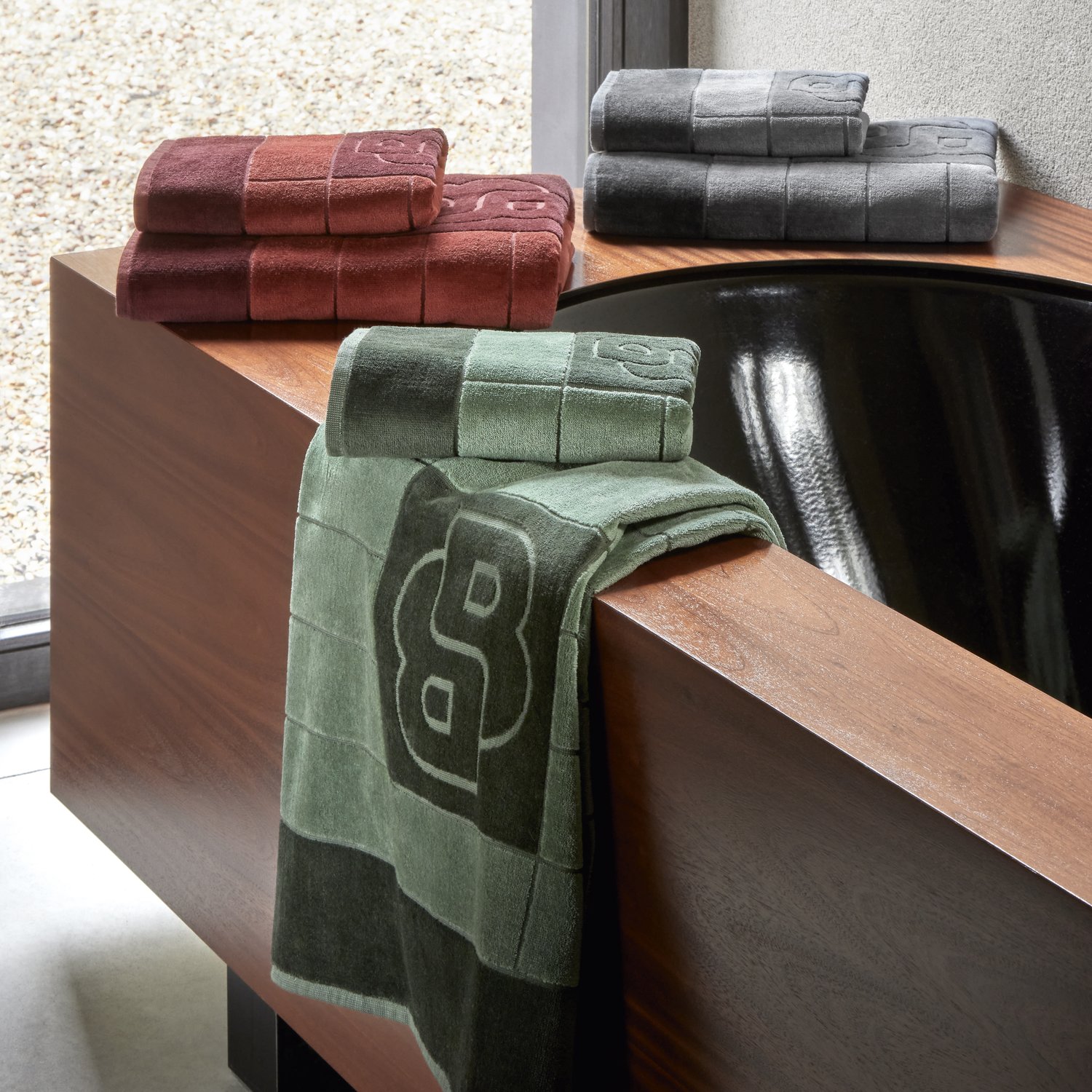 Nestas toalhas, o icônico monograma Double B é esculpido no tecido atoalhado e aparece em destaque. Cada peça oferece dois níveis de tom e um jogo duplo de texturas: veludo cotelê na frente e alças no verso. Listras finas cinzeladas na toalha enfatizam essa curva gráfica. Toalhas esculpidas em jacquard com o logotipo BOSS "Double B".