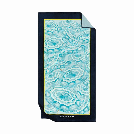 Combinação de cores: Azul com desenhos de guarda-sóis e uma moldura amarela