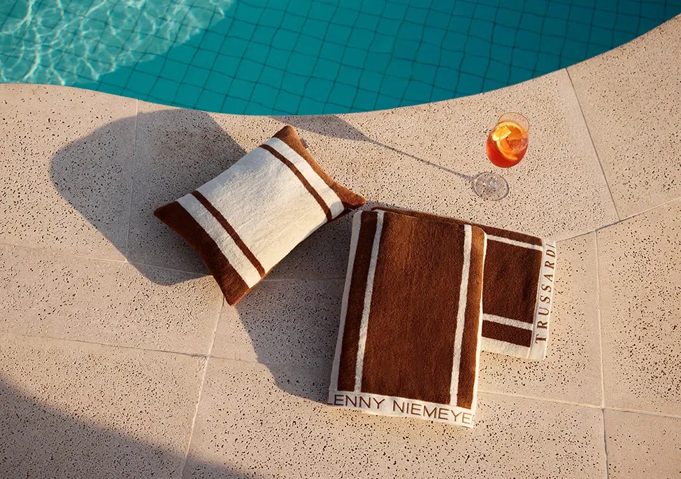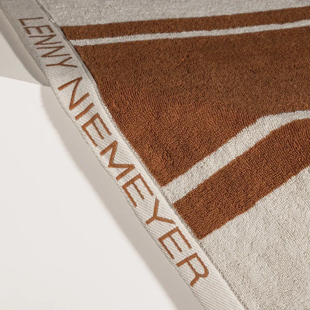 AcabamentoSuper absorção, Pré-encolhida, Fio Dupla Torção, Jacquard fio tinto, Bainha de 4cm com logo Trussardi e Lenny Niemeyer em jacquard, Embalagem dustbag de algodão orgânico certificado plantado no Brasil Desing exclusivo por Lenny Niemeyer