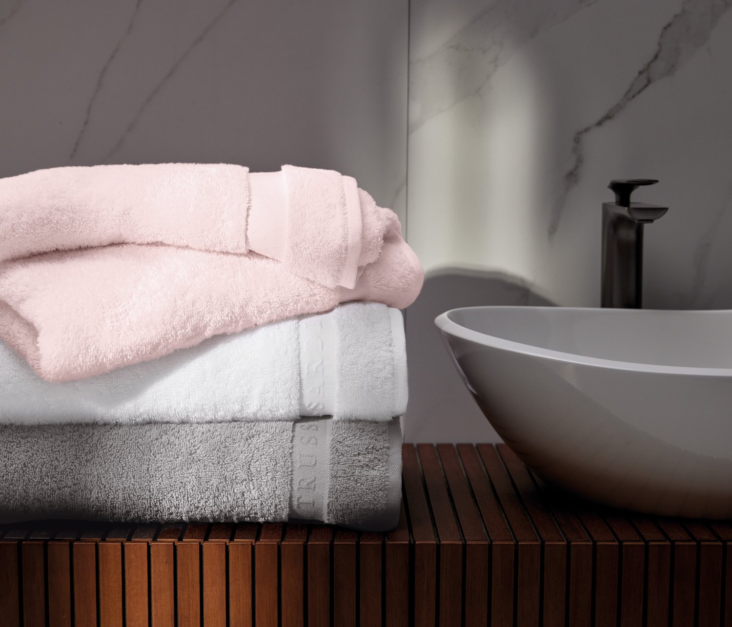 Acabamento: Super absorção, Pré-encolhida, Fio penteado de baixa torção, Tecnologia Cotone Speciale, Bainha com logo Trussardi