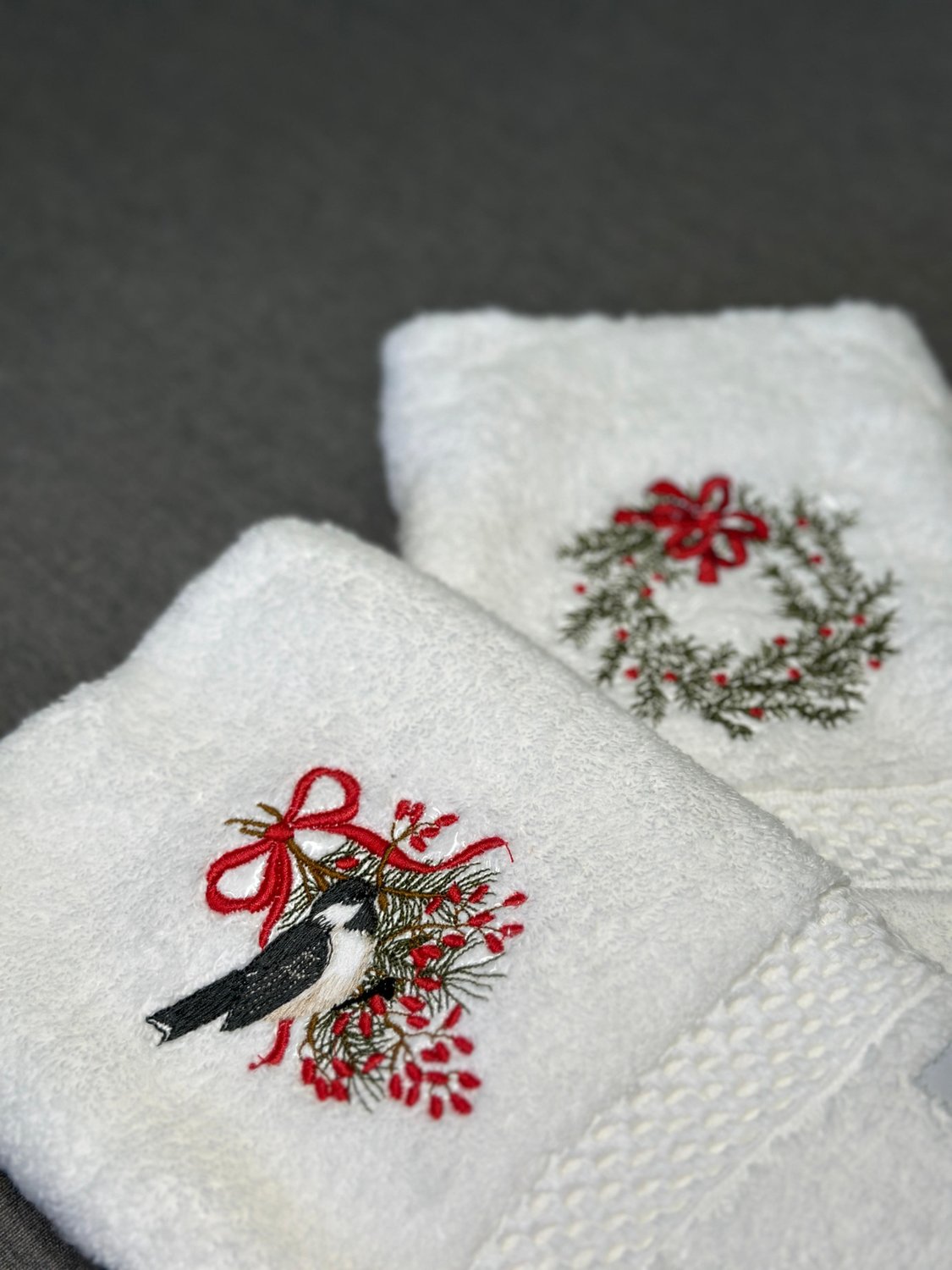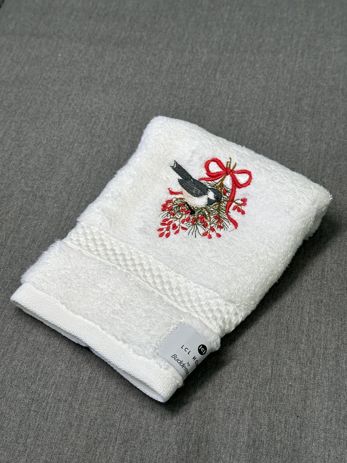Toalha de lavabo bordada com motivo natalino pássaro chickadee.
