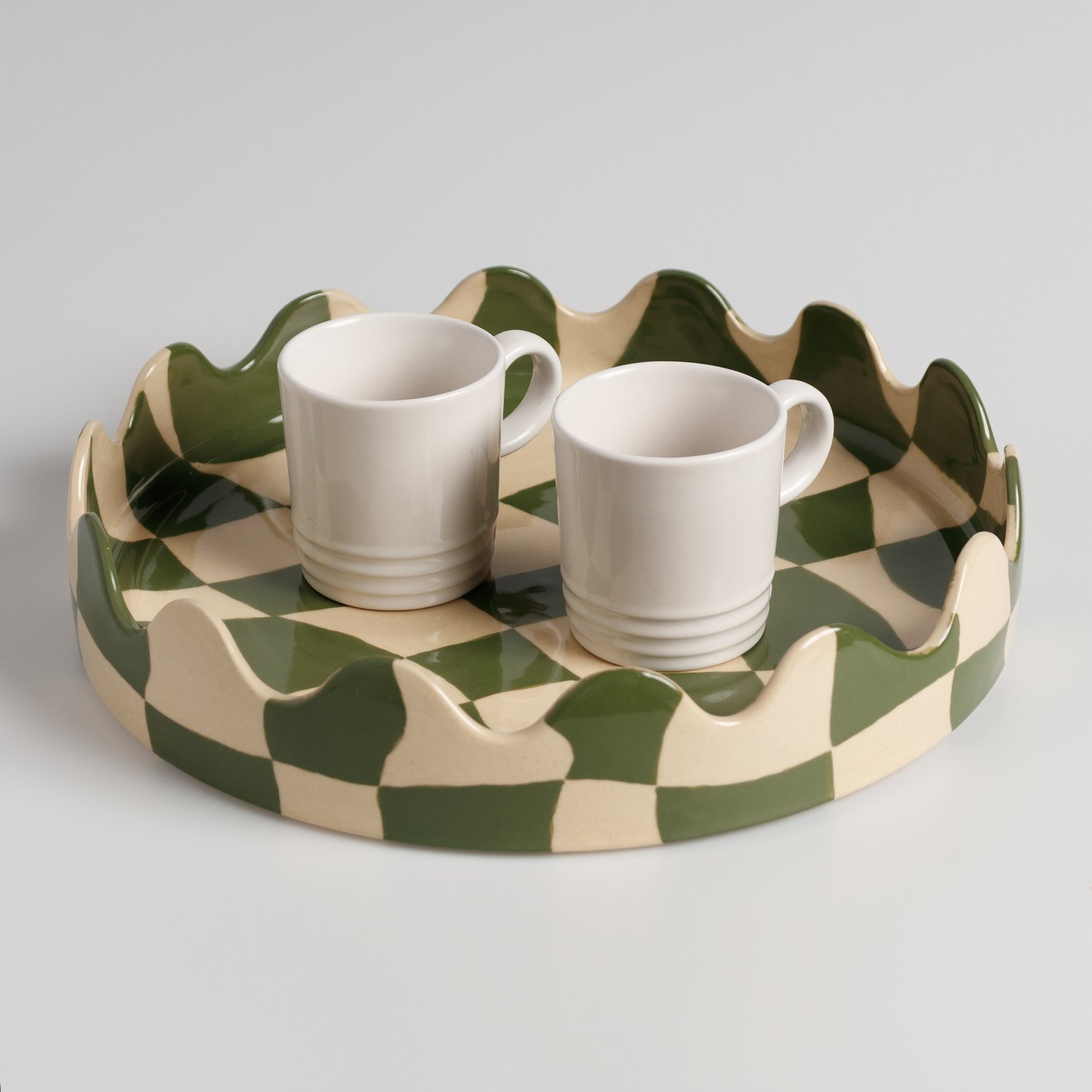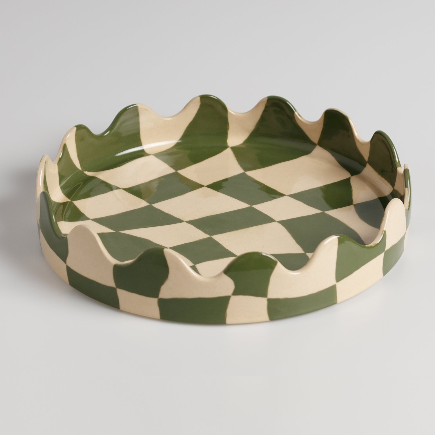 Produzida em cerâmica, possui uma borda irregular e estampa xadrez nas cores verde e nude, trazendo ainda mais charme e autenticidade para a peça. Ideal para compor sua mesa ou a decoração de sua casa.