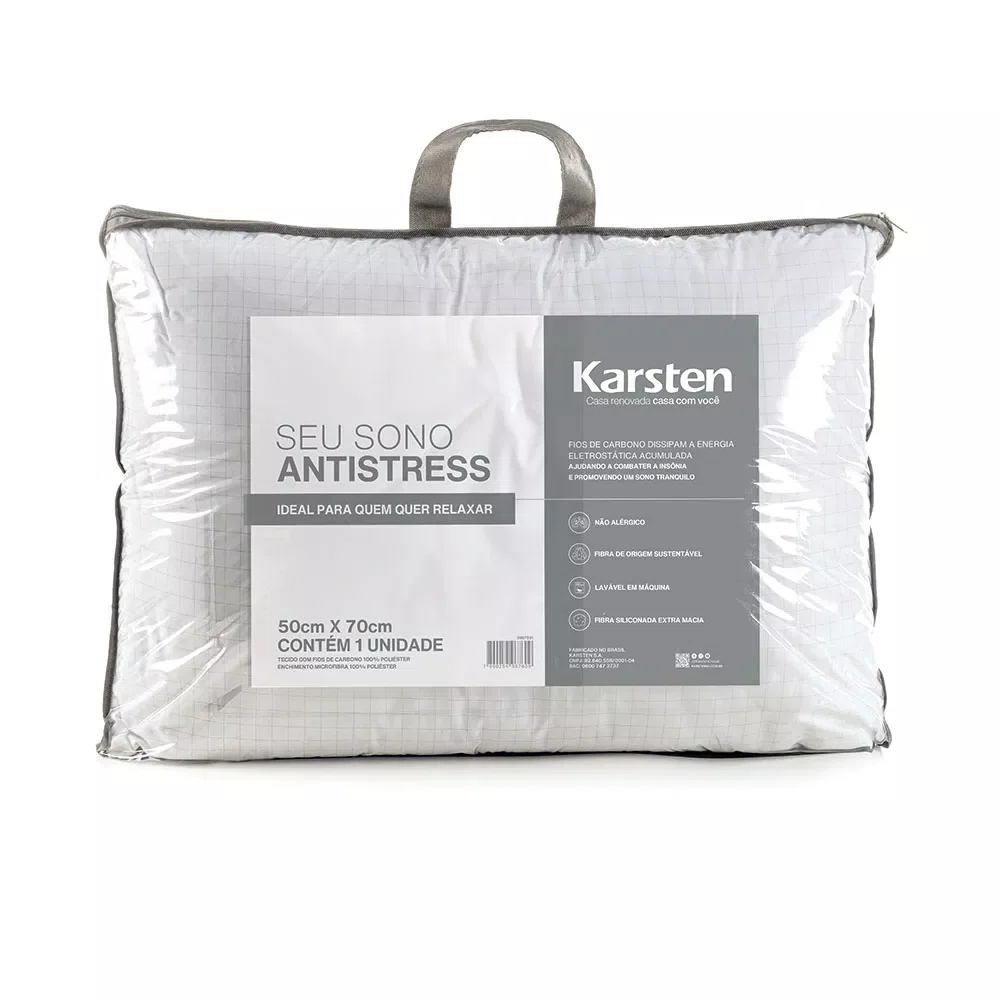 O Travesseiro Seu Sono Antistress Karsten é perfeito para quem deseja noites mais relaxantes e revigorantes. Com fios de carbono em sua composição, ele ajuda a dissipar a eletricidade estática, proporcionando uma sensação de bem-estar. Com gramatura de 720g/m² e recheio de microfibra siliconada reciclada, oferece maciez e respirabilidade. Sua capa 100% poliéster é durável e não alérgica, garantindo conforto e proteção. Ideal para quem busca descanso profundo e momentos de tranquilidade ao dormir. Para noites de sono reparadoras, a qualidade dos produtos de cama é indispensável, por isso Karsten, vem com opções de cama completa.