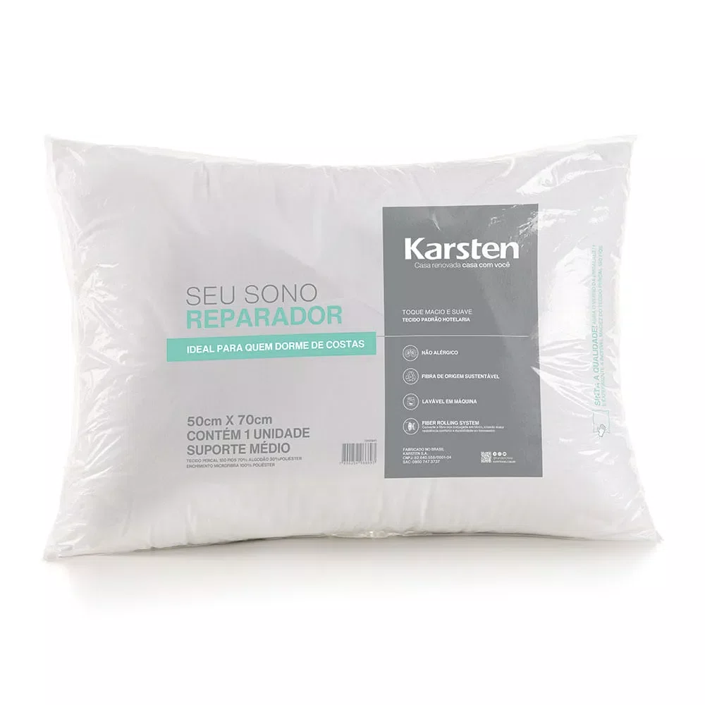 O Travesseiro Sono Reparador Karsten é ideal para quem busca conforto e cuidado ao dormir. Com medidas de 50cm x 70cm e suporte médio, oferece a sustentação perfeita para quem dorme de costas. Produzido com enchimento de fibra siliconada reciclada, é antialérgico e sustentável, cuidando do planeta e da sua saúde. A capa em Percal 180 fios, composta por 70% algodão e 30% poliéster, proporciona um toque suave e respirável. Esse travesseiro é a escolha ideal para noites tranquilas e reparadoras, unindo maciez, frescor e bem-estar em cada detalhe. Para noites de sono reparadoras, a qualidade dos produtos de cama é indispensável, por isso Karsten, vem com opções de cama completa.