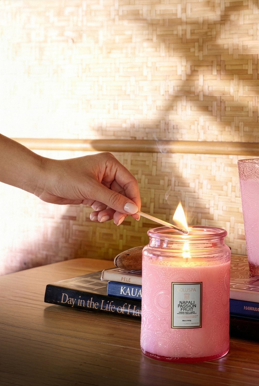 Informações Do Produto Marca Voluspa Modelo Napali Passion Fruit Queima 100 horas Aroma Frutada Fragrância Maracujá maduro, goiaba suculenta e abacaxi refrescante se combinam com a cremosidade do leite de coco e o calor suave da baunilha Pavio(s) natural(ais) 1 Vegano