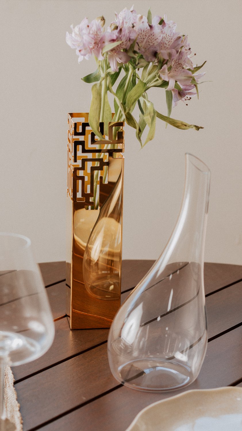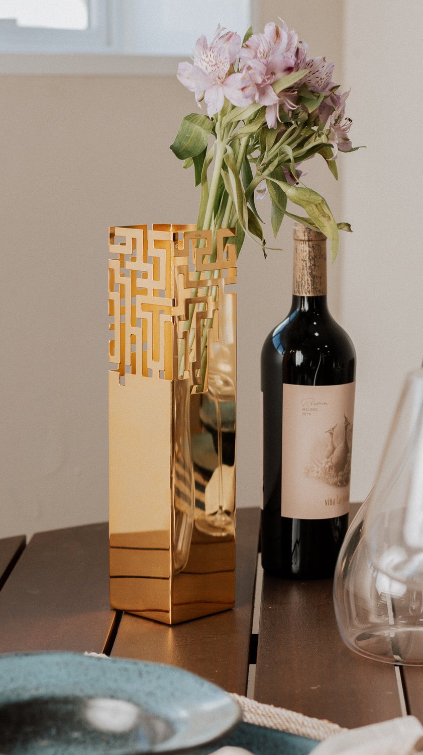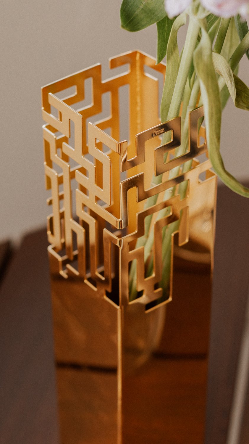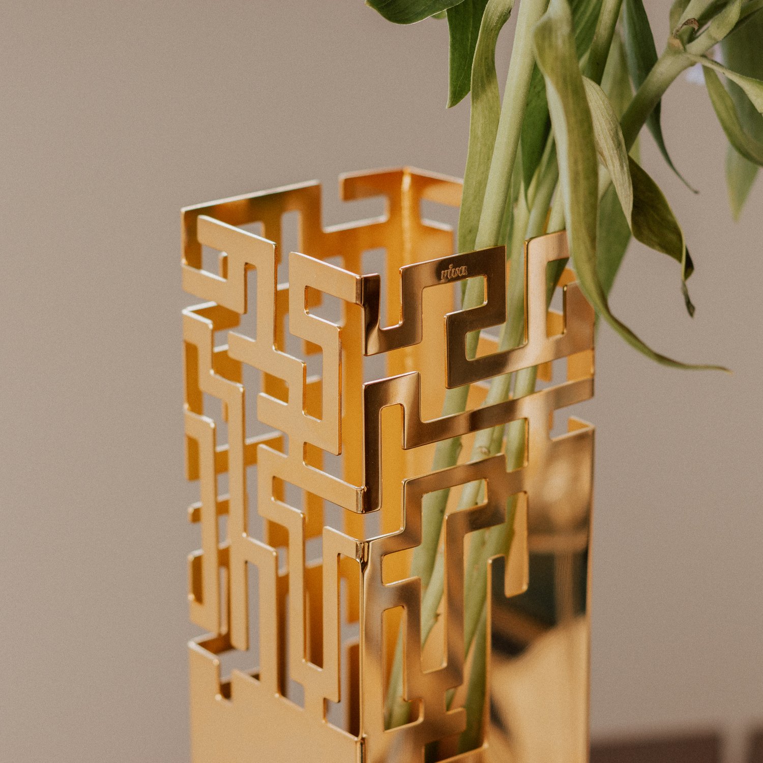 Os Vasos / Castiçais Labirinto possuem recortes diferentes em suas extremidades. Conforme a extremidade disposta, o castiçal oferece luminosidade de intensidades distintas. Produzido com recortes precisos realizados na chapa do aço inox 18 / 10, é um objeto que encanta pelo brilho e acabamento impecável. Abuse de diferentes tamanhos e acabamentos para compor o ambiente.