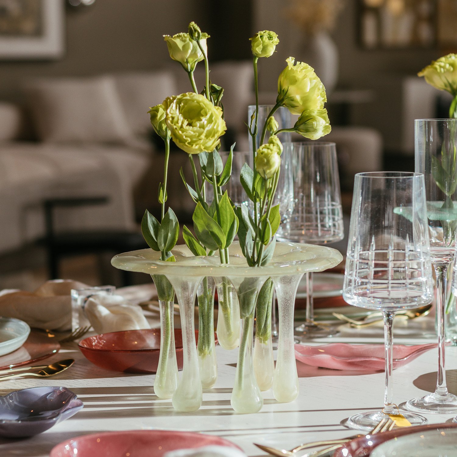 O Vaso Gotas de Vidro Artesanal é uma obra-prima que combina a beleza do design contemporâneo com a habilidade artesanal única. Cada vaso é meticulosamente moldado à mão por artesãos especializados, resultando em uma peça excepcional que cativa pela sua elegância e singularidade. A forma única em cascata, reminiscente de delicadas gotas d'água, confere ao vaso um apelo visual distinto.