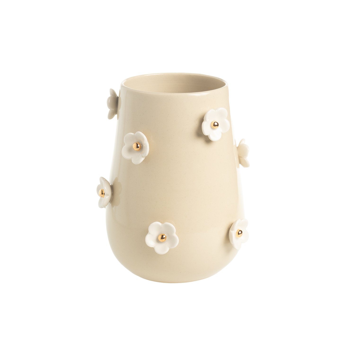 Delicado e cheio de charme, o Vaso Nina Flor é feito em cerâmica de alta temperatura e decorado com flores aplicadas à mão. O miolo de cada flor recebe pintura em ouro 24k, criando um contraste sutil e elegante com o tom claro da peça. Flores aplicadas uma a uma manualmente.