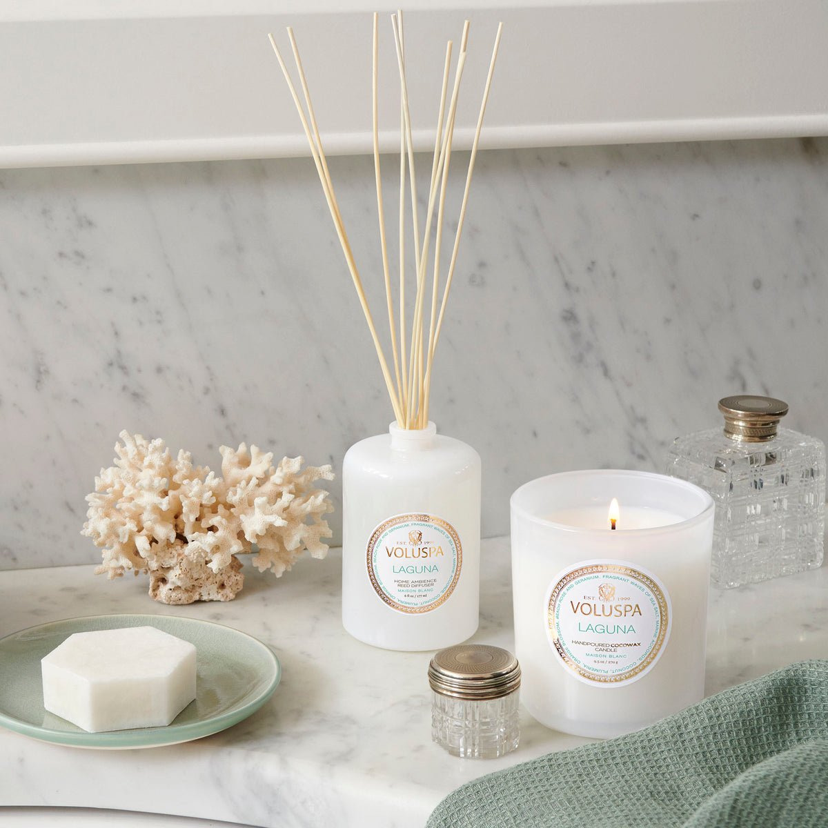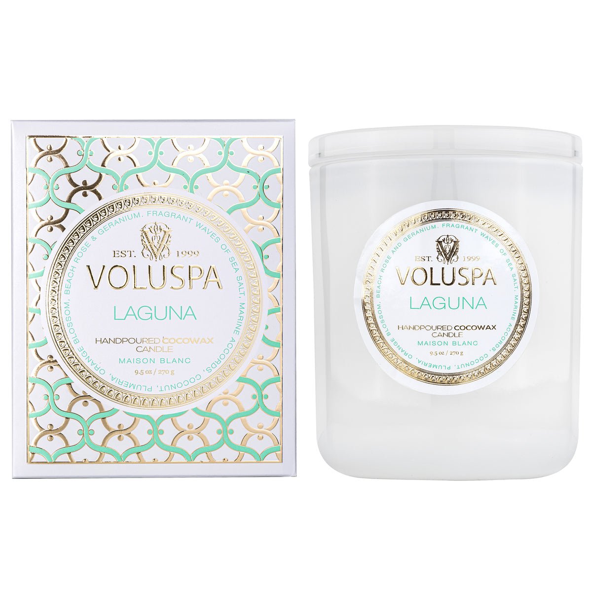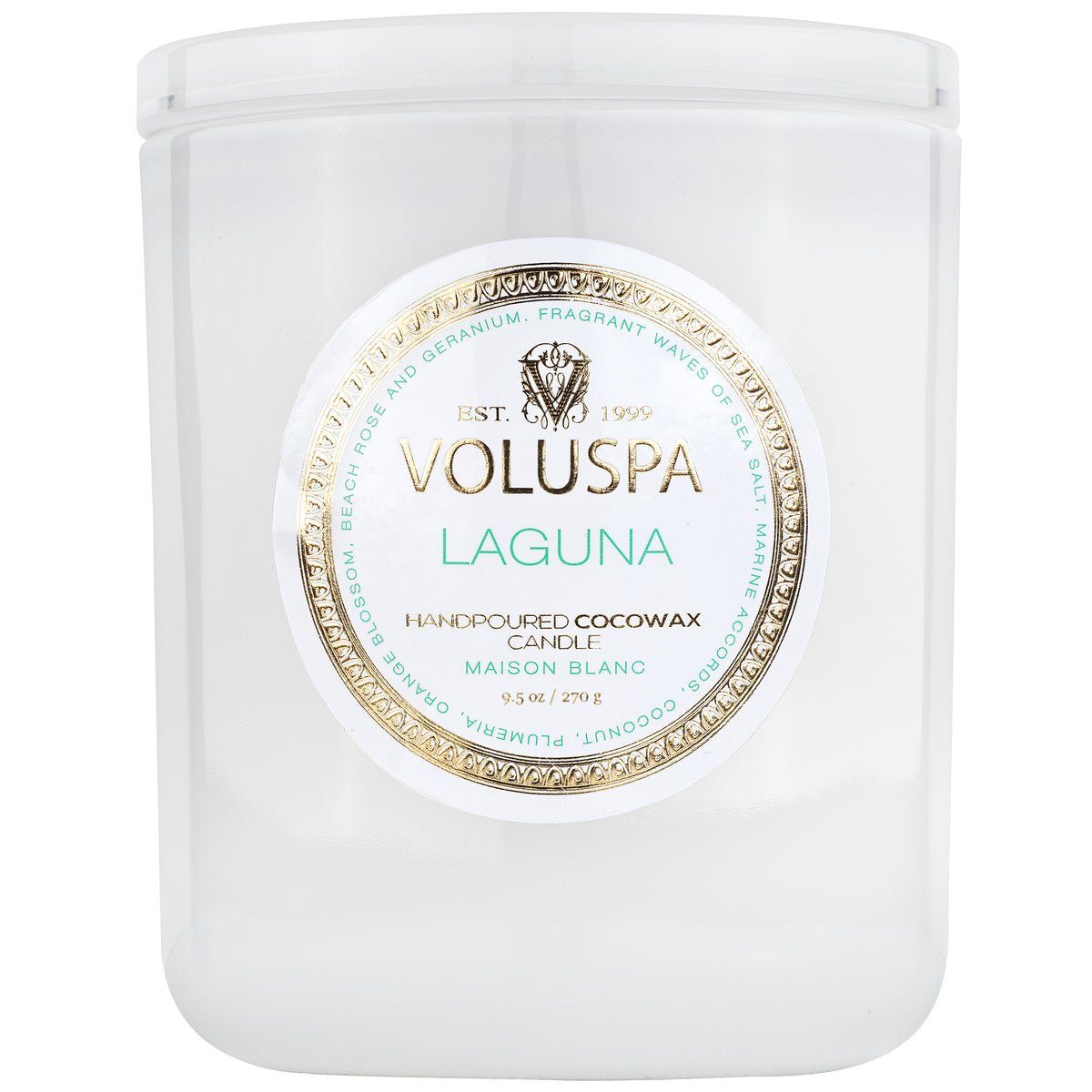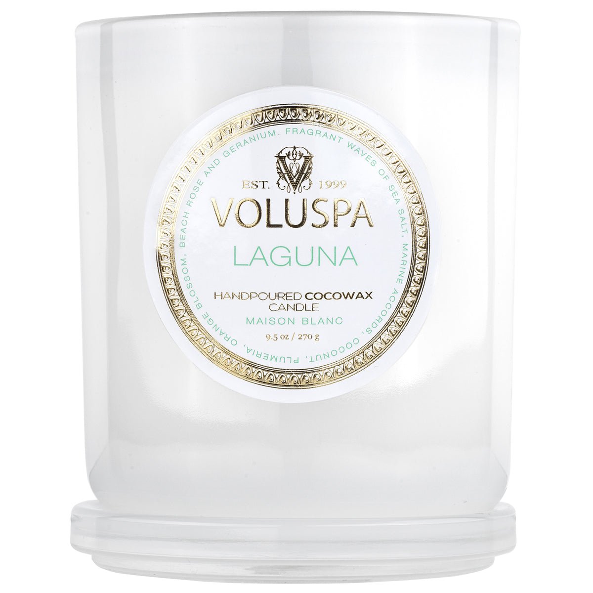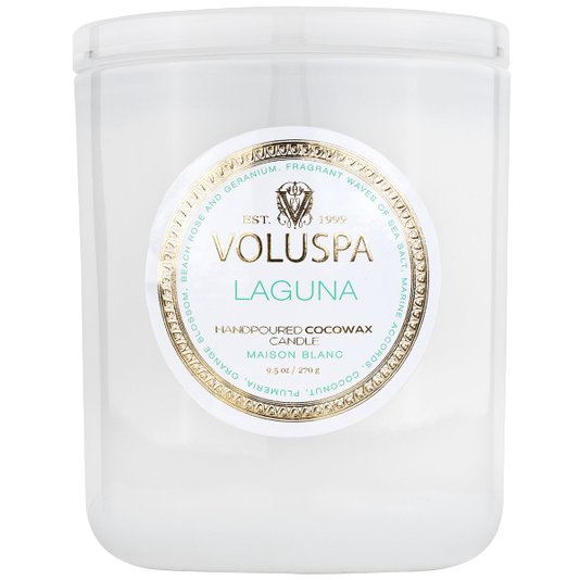 Vela Laguna, da coleção Maison Blanc da Voluspa. Com duração de 60 horas, é perfeita para presentear alguém especial com estilo. Ela possui um design moderno, sendo ideal para fazer parte da decoração. Fragrância inspirada na mistura do sal marinho, plumeria e coco.