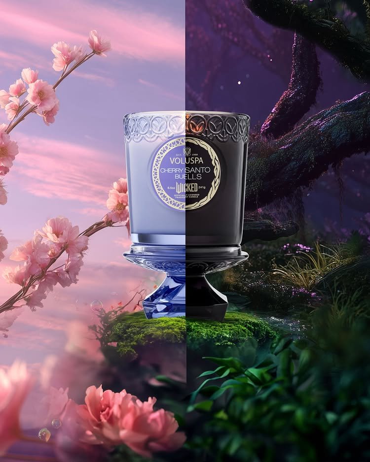 O perfume é o toque final dessa aventura sensorial do cinema. A Voluspa se inspirou na magia de Elphaba e Glinda, quebrando padrões para criar uma experiência única de aromas e beleza surpreendente.