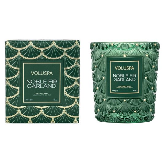O vidro é adomado elegantemente com ornamentos dourados pintados a mão, simulando uma clássica árvore de Natal. A embalagem externa do produto exala o verde monocrático espelhando a estampa Art Déco, finalizada em detalhes metálicos dourados. Presenteie e reúna com Noble Fir Garland. Ramos perfumados e notas de âmbar brilhantes que espalham calor ao redor da árvore. Viva o natal!