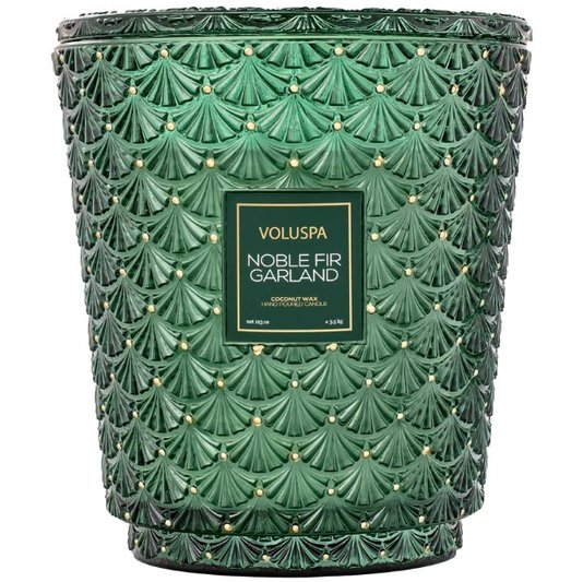 O vidro é adomado elegantemente com ornamentos dourados pintados a mão, simulando uma clássica árvore de Natal. A embalagem externa do produto exala o verde monocrático espelhando a estampa Art Déco, finalizada em detalhes metálicos dourados. Presenteie e reúna com Noble Fir Garland. Ramos perfumados e notas de âmbar brilhantes que espalham calor ao redor da árvore. Viva o natal!