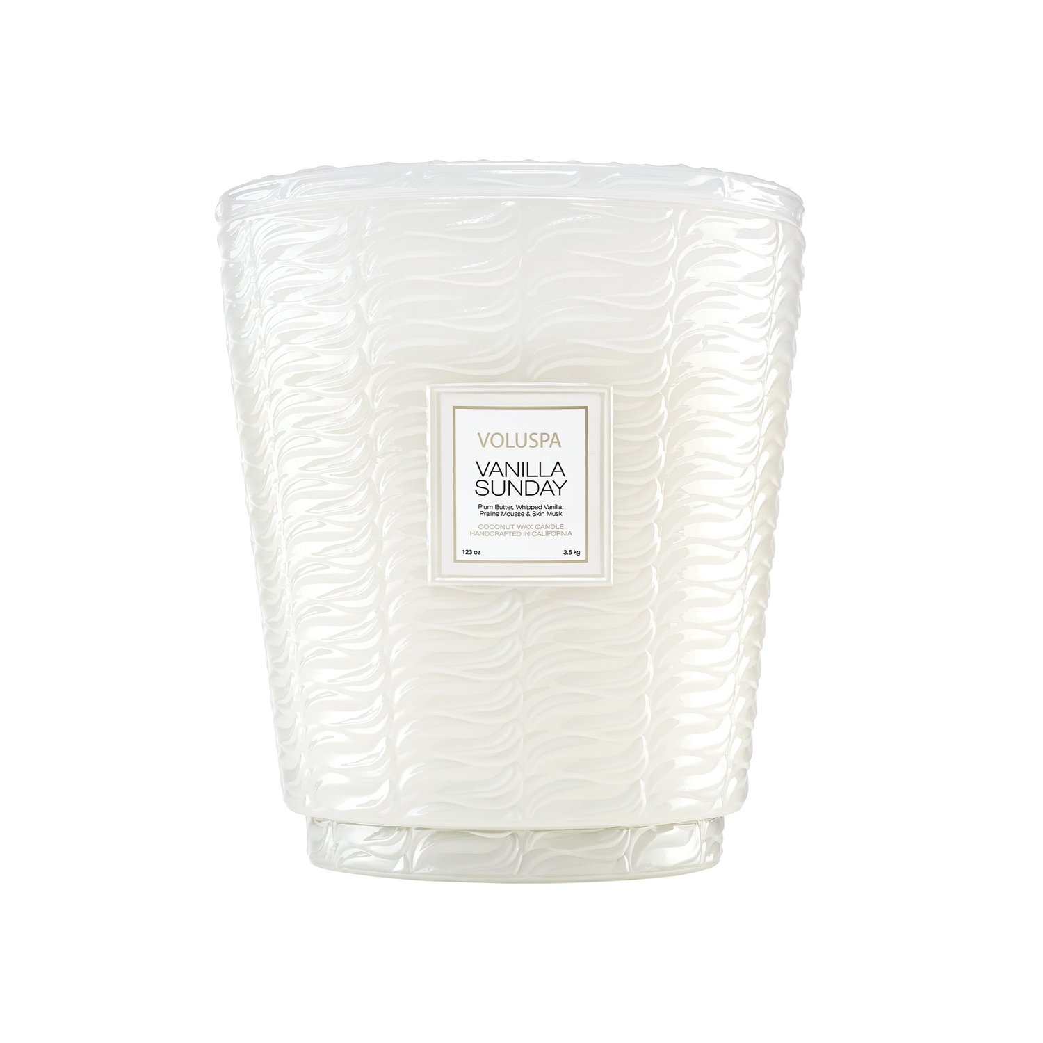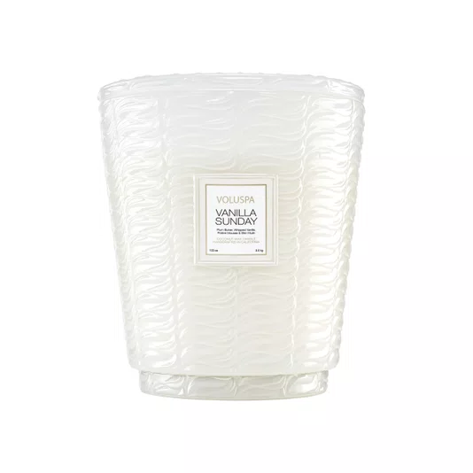 Informações Do Produto Marca Voluspa Modelo Vanilla Sunday Queima 250 horas Aroma Doce Fragrância A suavidade da ameixa e o frescor delicado da frésia misturados com notas de baunilha batida, pralinê, íris, âmbar e musk Pavio(s) natural(ais) 5 Peso 3,5 Kg Vegano